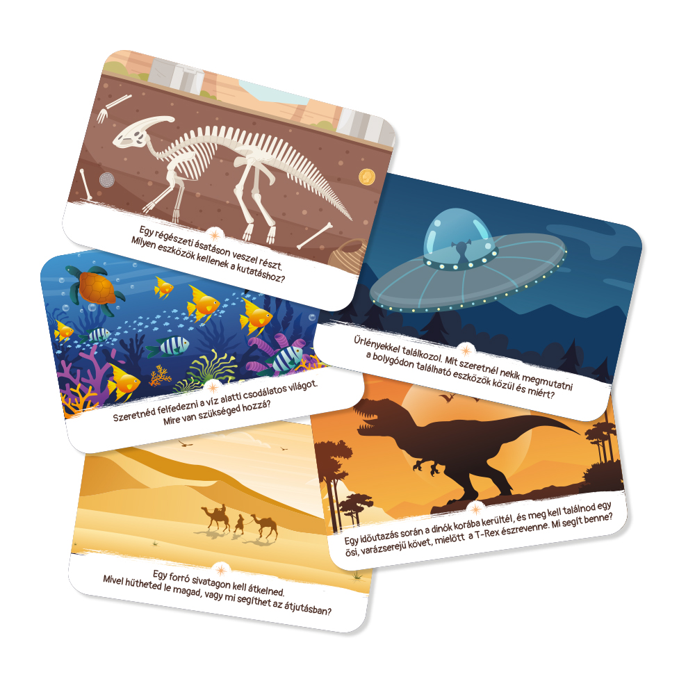 Iată, din nou, un joc de cărți de la Mental Focus foarte frumos executat, care imediat dă motivație copiilor; nu trebuie să-i implorăm să facă ceva. Atunci când copiii văd imaginea, se așază imediat la masă. Abia așteptau să deschid cutia! Împreună, am aranjat pachetele care constau din cărți rotunde și în formă de cărămidă. Le-a plăcut foarte mult cărțile de evenimente cu față-verso, puteau alege care versiune să le-o citesc cu voce tare. O parte ascunde o problemă cotidiană, cealaltă una de basm. Deoarece sunt preșcolari, au preferat imaginile cu teme fantastice. Este puțin interesant, puțin mistic, lasă loc imaginației și, desigur, eliberează potențialul extraordinar al copiilor, deoarece acum supereroii pot fi chiar ei înșiși.